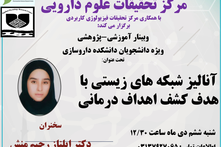 وبینار پژوهشی تحت عنوان: آنالیز شبکه های زیستی با هدف کشف اهداف درمانی -ویژه دانشجویان و پژوهشگران با سخنرانی دکتر ایلناز رحیم منش استادیار مرکز تحقیقات فیزیولوژی کاربردی- 6 دی ماه ساعت 12/30